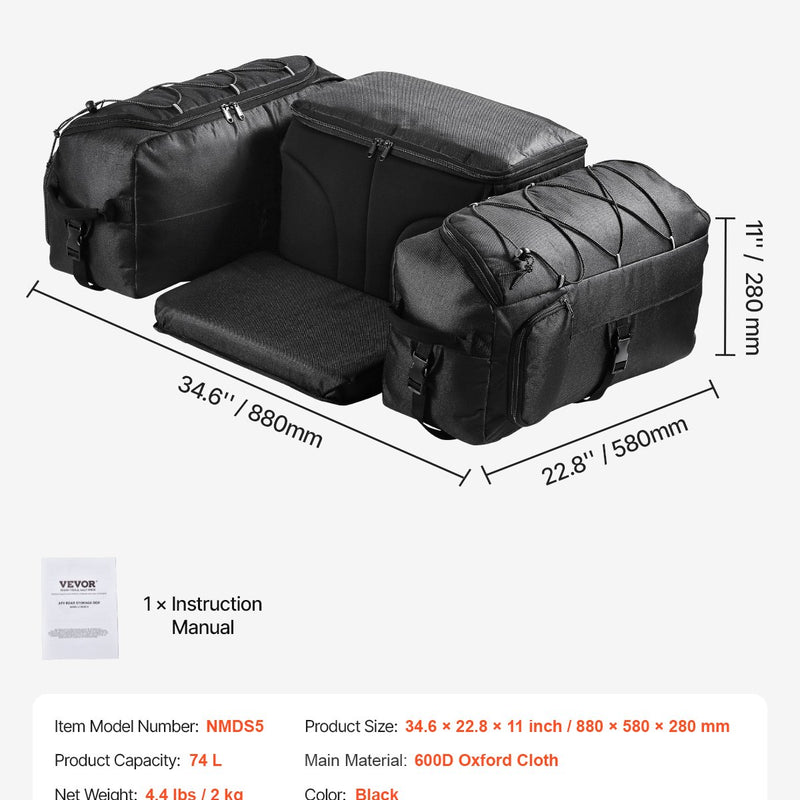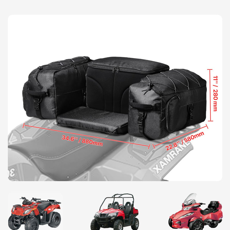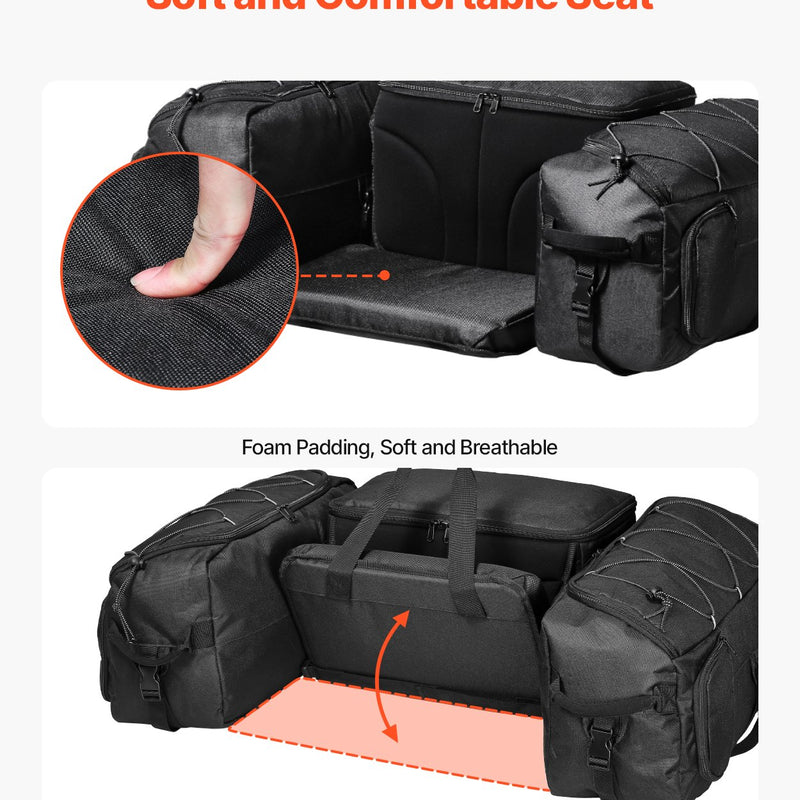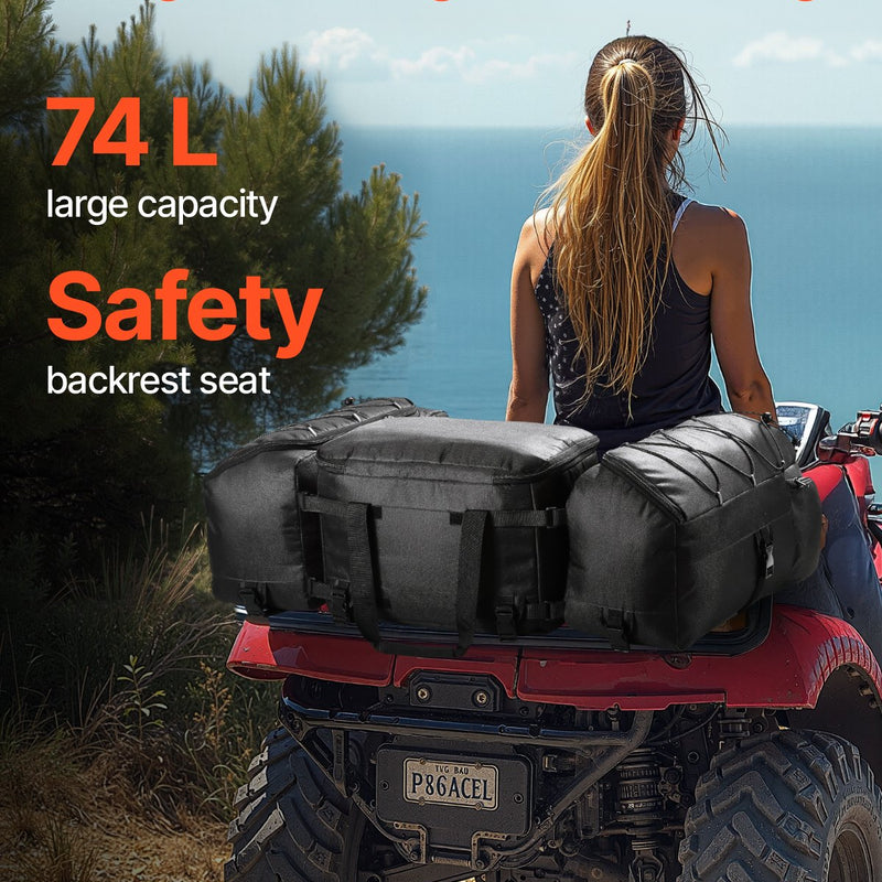 VEVOR ATV soma ar 74 L ietilpību sastāv no trim glabāšanas nodalījumiem - centrālais termo nodalījums uztur pārtiku vai dzērienus vēsus vasarā un siltus ziemā vairākas stundas, savukārt pārējie divi nodrošina plašu vietu ķiverēm, cimdiem, instrumentiem un citiem piederumiem.