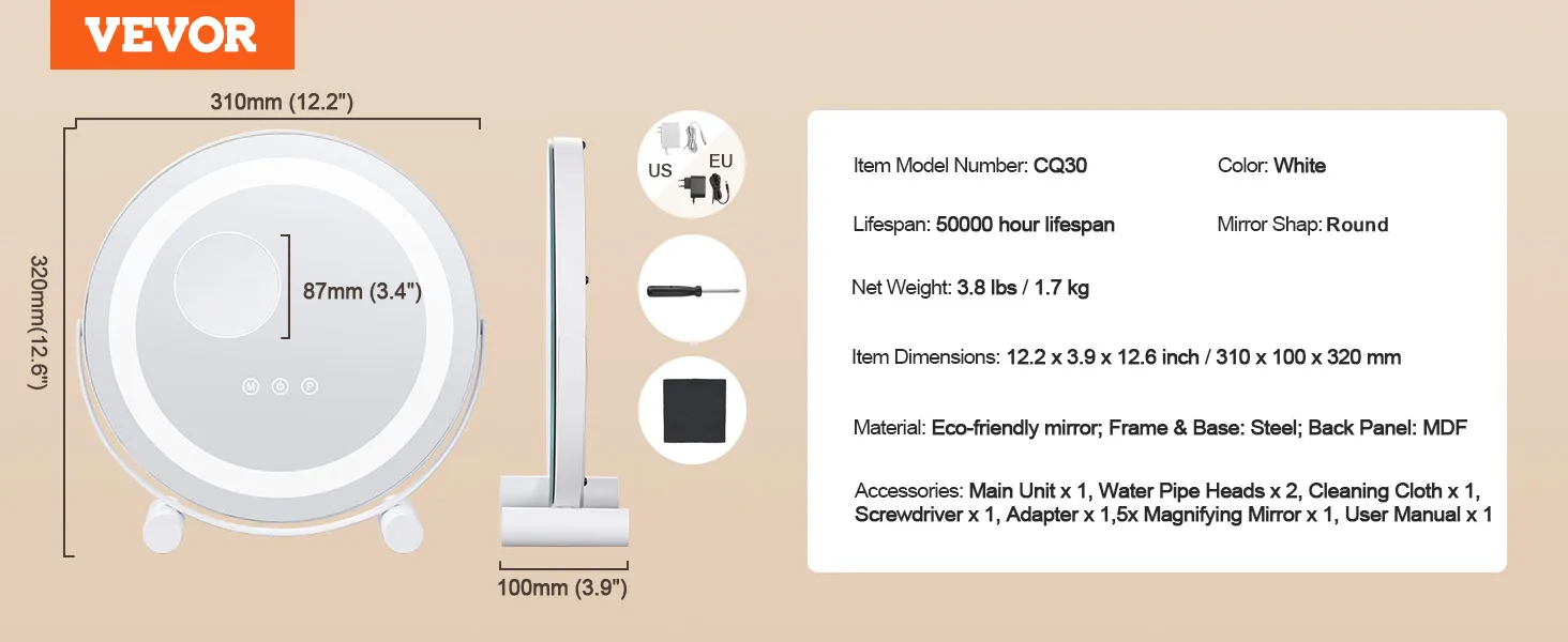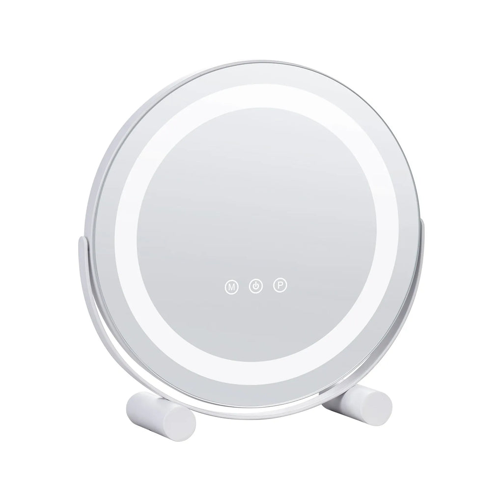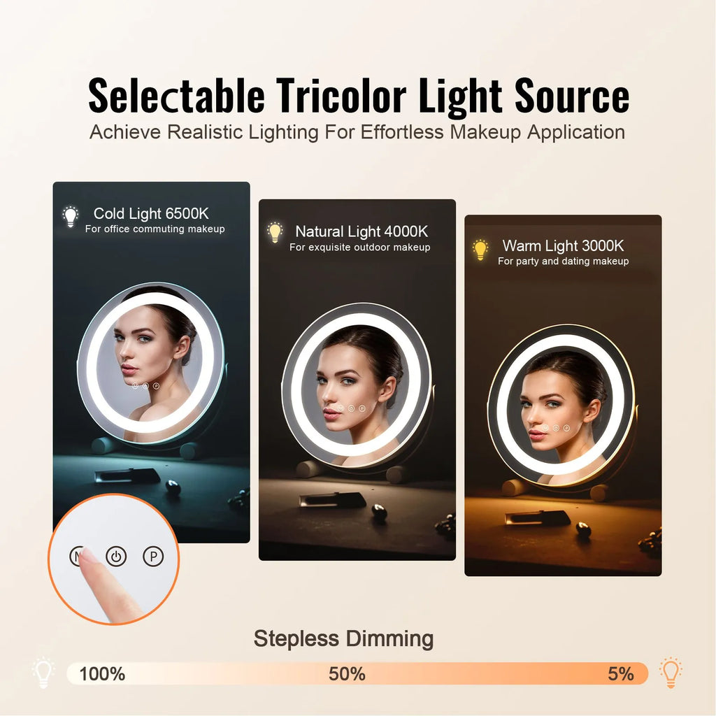 VEVOR apaļš LED grima spogulis ar apgaismojumu, 30 cm spogulis ar 3 gaismas režīmiem, 5× palielinājumu, skārienvadību un 360° rotāciju tualetes galdam (balts)