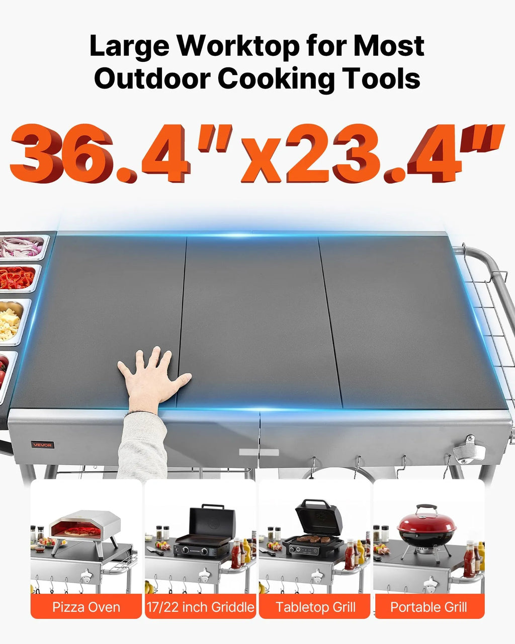 Īpaši liela darba virsma: Ar 925 × 595 mm virsmu grila galds ir piemērots populārām picas krāsnīm, plakanajiem griliem, galda iekārtām un portatīvajām plītīm. Paplašinātais dizains nodrošina vairāk vietas ēdiena sagatavošanai un servēšanai, veicinot ērtu āra gatavošanu.