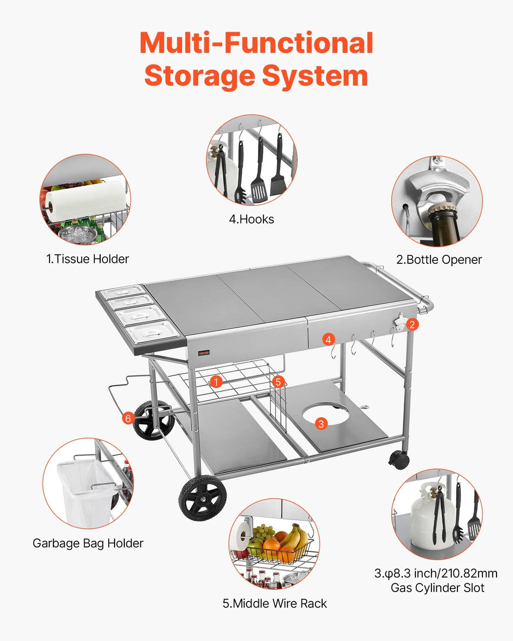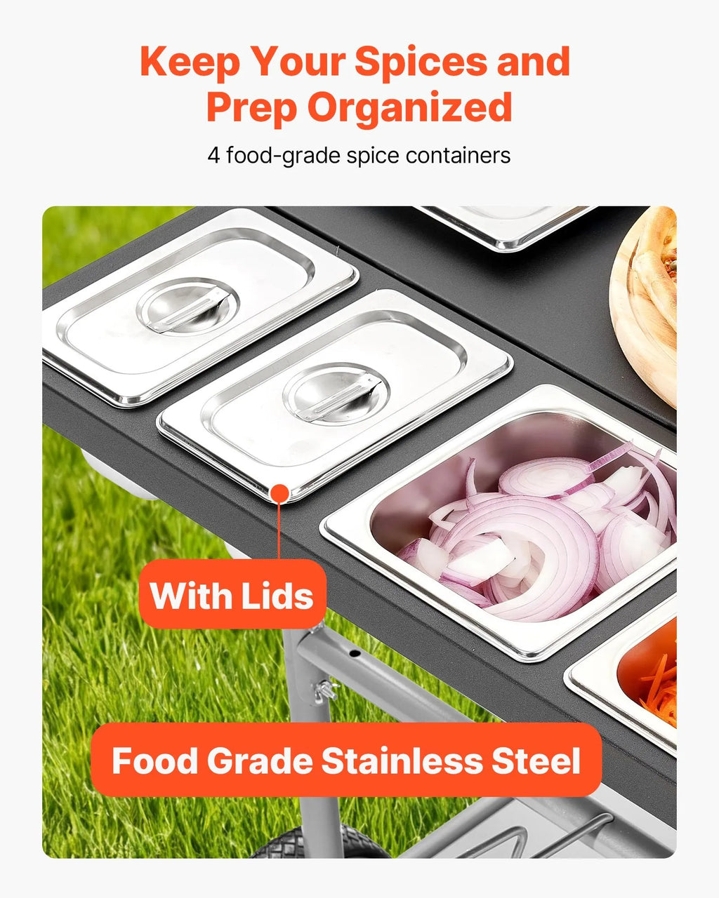 Plaša un organizēta uzglabāšana: Āra BBQ galds ietver divus plauktus, noņemamu vidējo grozu, 4 garšvielu traukus ar vākiem no 201 nerūsējošā tērauda un 4 āķus efektīvai piederumu organizēšanai.