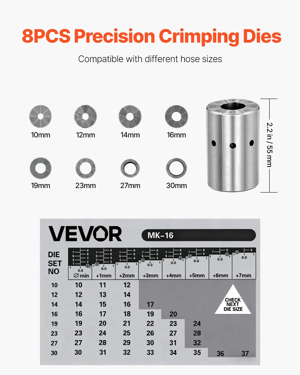 VEVOR augstspiediena hidrauliskais šļūteņu presētājs, manuāls presēšanas instruments ar 8 presformām, presēšanas diapazons 6–28 mm, piemērots zema un augsta spiediena eļļas šļūtenēm, gāzes, ūdens, auto A/C šļūtenēm un kabeļu savienojumiem