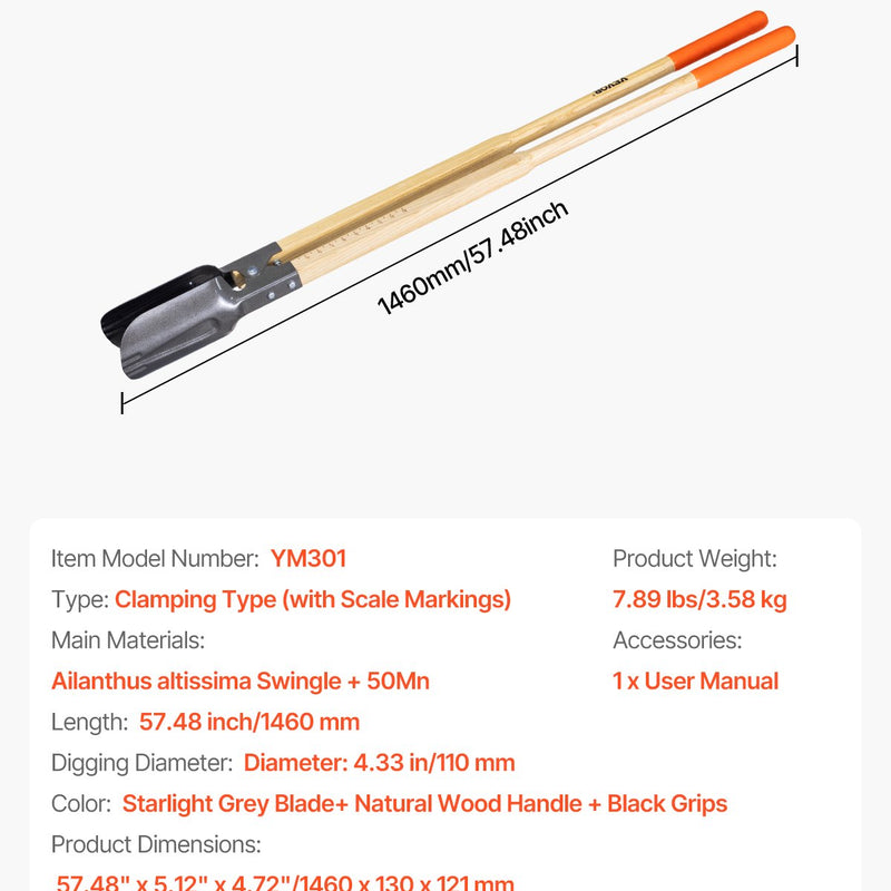 Ergonomisks dizains: 1460 mm garais caurumu rakšanas instrumenta rokturis samazina saliekšanās un nogurumu lietošanas laikā. Kaņepju astiņa nodrošina stingru satvērienu ar pret-slīdēšanas funkcionalitāti, ļaujot to lietot ilgāk, neradot nogurumu rokās. Mēroga atzīmes palīdz uzraudzīt rakšanas dziļumu reāllaikā.