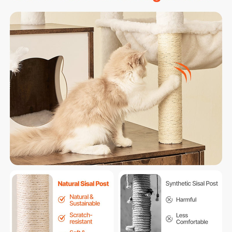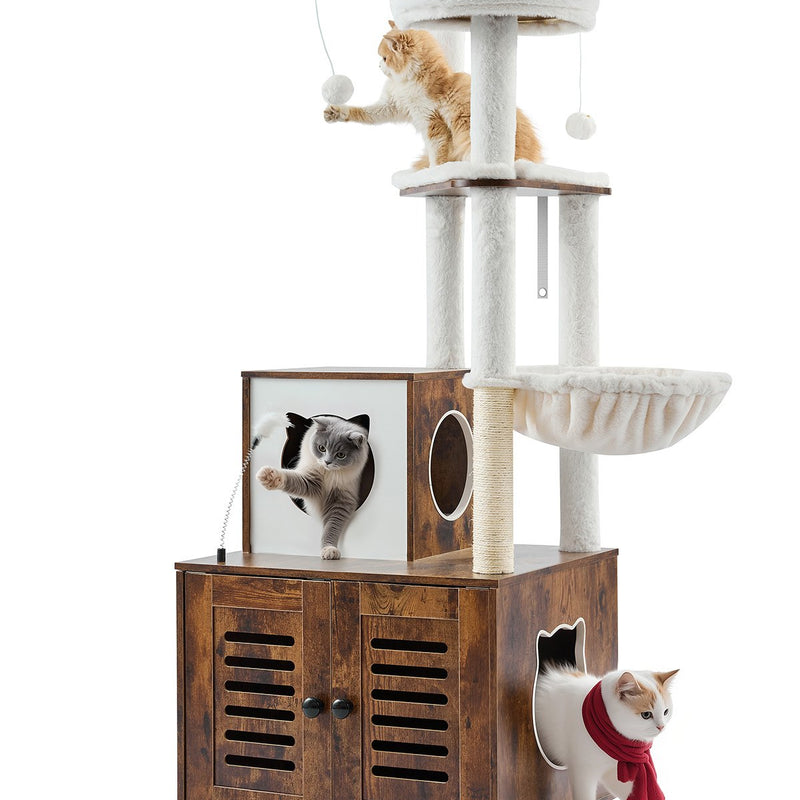 Šis daudzfunkcionālais kaķu koks ir ideāls spēlēšanai un atpūtai. Ar sisala skrāpēšanas stabiem, ērtu mākslīgā truša kažokādas spilvenu un iebūvētu kaķu tualetes skapīti jūsu kaķis būs aizņemts, bet jūsu mājās valdīs svaigs aromāts.