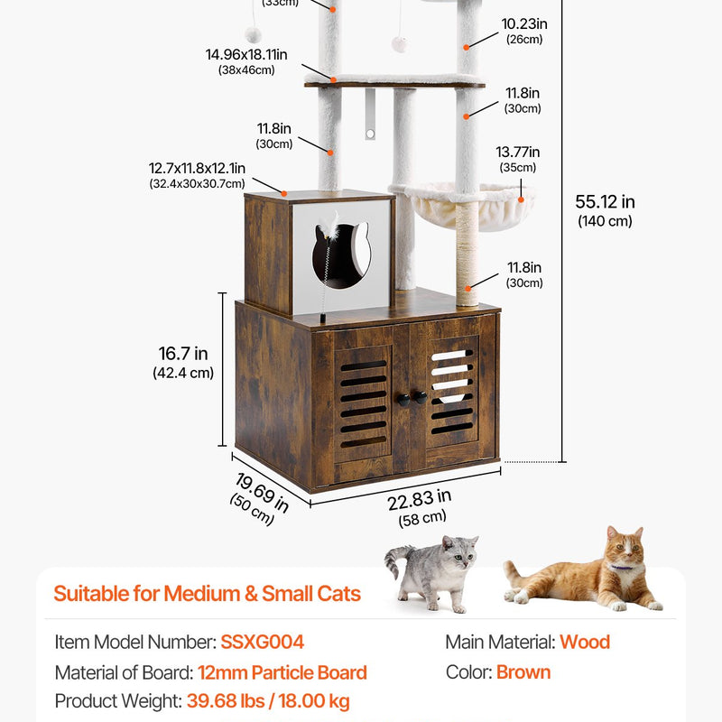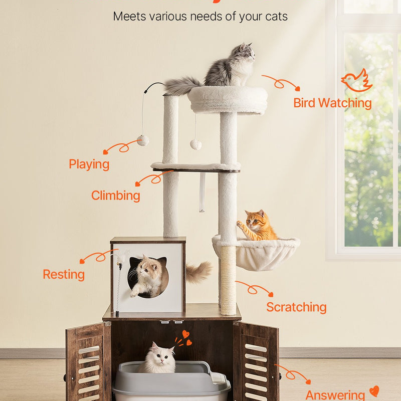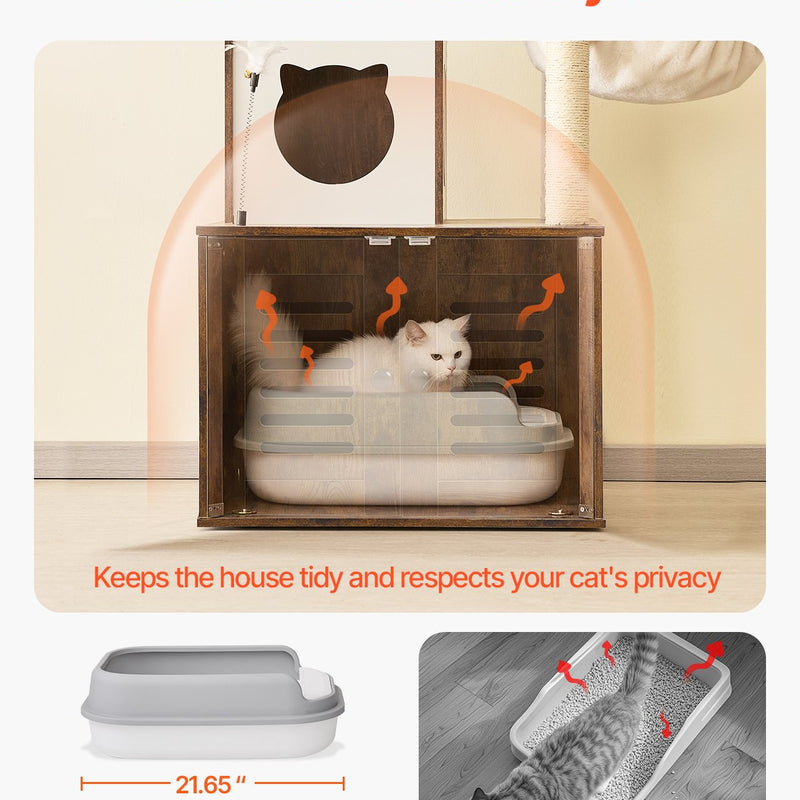 Daudzfunkcionāls kaķu koks: Atvadieties no nekārtības. Šis 2-в-1 skrāpēšanas koks apvieno kaķu tualetes skapīti ar vairāku līmeņu kaķu rāpšanās torni, piedāvājot jūsu kaķim privātu telpu un jautru spēļu zonu. Kaķu tualetes apmales palīdz samazināt nevēlamus aromātus un izkaisītu pakaišu, nodrošinot tīru un stilīgu māju. Saderīgs ar kaķu tualetēm, kuru izmērs ir 55 x 48 x 39 cm.
