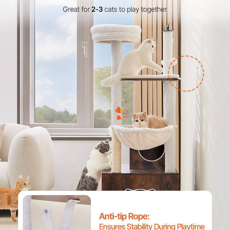 Šis kaķu tornis ietver jautrus spēļrīkus, piemēram, pakārtojošo bumbu un pīkstošo rotaļlietu, lai uzbudinātu jūsu kaķa ziņkārību un rotaļīgumu. Dabiskie sisala stabi apmierina viņa skrāpēšanas instinktu, kamēr daudzstāvu dizains nodrošina papildus iespējas šī instinkta apmierināšanai.