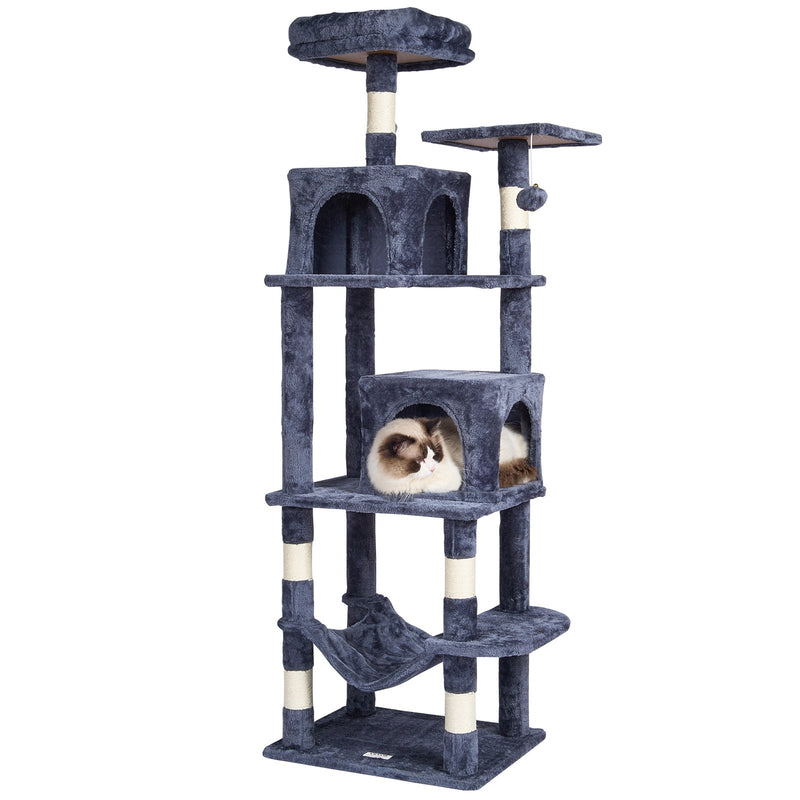 Tornī ir divas ietilpīgas kaķu mājiņas, augšējā platforma un šūpuļtīkls, kas nodrošina dažādas un mājīgas atpūtas vietas. Mīkstais plīša pārklājums ir saudzīgs ādai un nagiem, nodrošinot augstu komforta līmeni. Platformu daudzveidība ļauj katram kaķim izvēlēties sev piemērotāko vietu gan spēlei, gan atpūtai, īpaši svarīgi mājsaimniecībās ar vairākiem kaķiem.