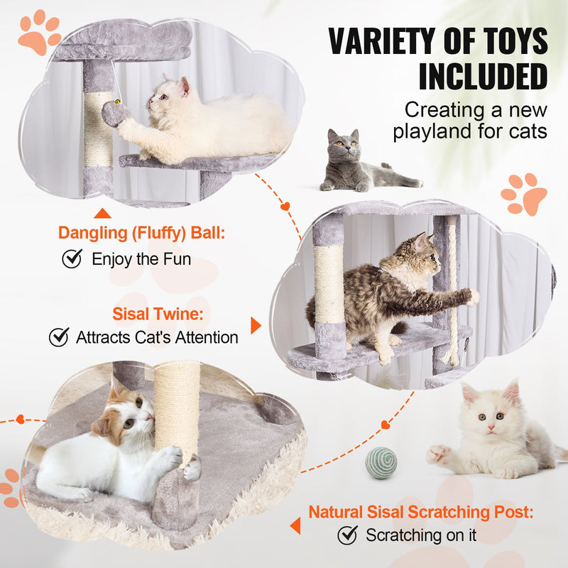 Tornī iekļautas piekaramās bumbiņas un atsperu rotaļlietas, kas piesaista kaķu uzmanību un rosina to rotaļīgumu. Sizala skrāpēšanas stabi kalpo kā ideāla vieta izstaipīšanai un nagu kopšanai, vienlaikus pasargājot mēbeles no bojājumiem. Skatoties, kā jūsu kaķi rotaļājas un mijiedarbojas ar torni, arī jūs gūsiet prieku.