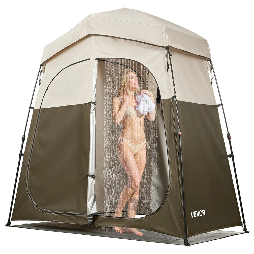 Plašs 2 nodalījumu dizains: Izmērs 2140 × 1120 × 2130 mm ļauj āra dušas telti vienlaikus izmantot divām personām. Divu zonu izkārtojums nodrošina sausās un mitrās zonas atdalīšanu — vienā pusē iespējams dušoties, bet otrā nosusināties vai pārģērbties.
