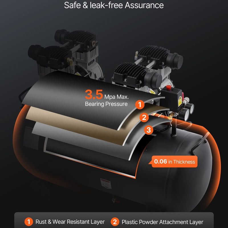 Bez-eļļļas gaisa kompresors izmanto vienlaicīgu caurules un cilindra ieplūdi, kas ļauj ietaupīt laiku un pūles. Ieplūdes caurule izgatavota no augsttemperatūras izturīga silikona un nerūsējošā tērauda pītā pārklājuma, nodrošinot dubultu aizsardzību pret bojājumiem un koroziju.