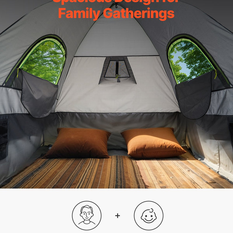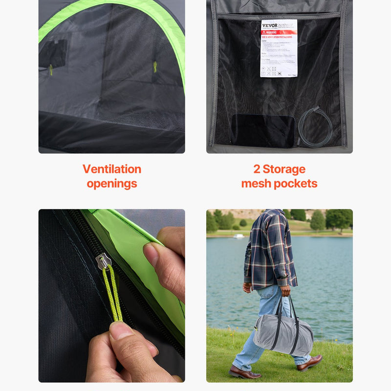 Ērti papildu elementi: Telts ir aprīkota ar ventilācijas logiem un sieta kabatām, kas nodrošina ērtu mantu glabāšanu, kā arī organizētu un komfortablu vidi, lai baudītu nakšņošanu zem zvaigznēm.