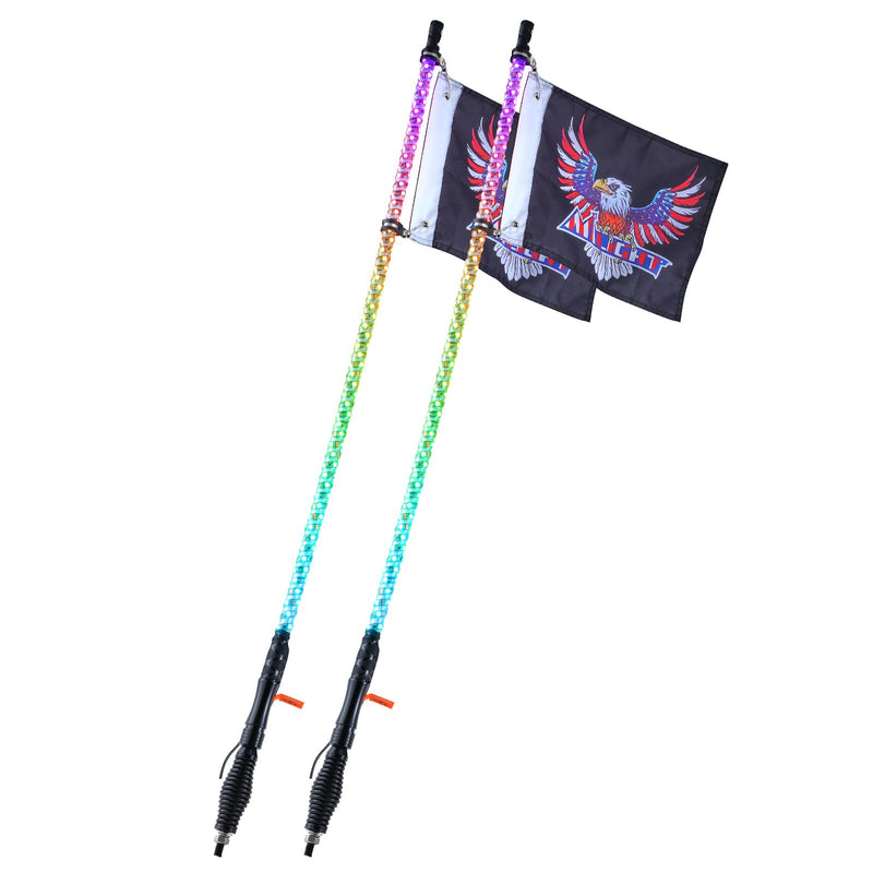 Lietotnes un tālvadības pults vadība: Šīs 2 gab. 1,2 m LED spirālveida antenas gaismas ar 4 karogiem nodrošina ērtu vadību, izmantojot 10 m RF tālvadības pulti un mobilo lietotni ar Bluetooth savienojumu. Izvēlieties no daudzām iespējām, tostarp RGB krāsu ritenis, zibspuldzes režīmi, spilgtuma līmeņi, dinamiskie ātrumi, statiskas krāsas, taimeri, ainu režīmi un citas funkcijas.