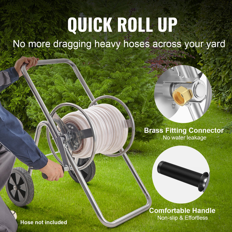 Тележка для шланговой катушки VEVOR с прочной стальной рамой, стальным порошком с серебряным напылением и всеми латунными фитингами.