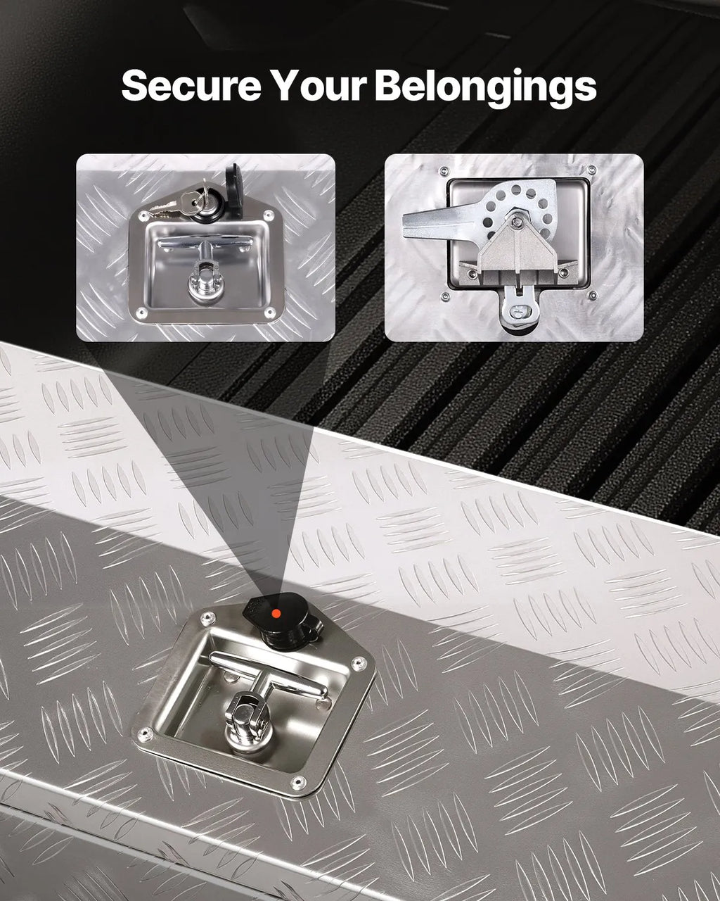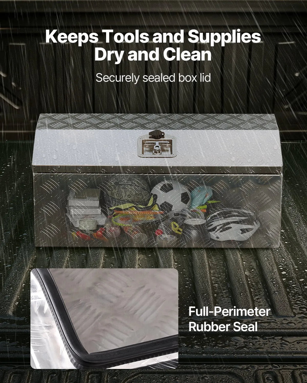 Liela uzglabāšanas ietilpība: Šī ietilpīgā kravas automašīnas instrumentu kaste, 762 × 330,2 × 330,2 mm, nodrošina pietiekami daudz vietas spaiņiem, remonta instrumentiem, ugunsdzēšamajiem aparātiem, brīdinājuma zīmēm, kā arī kempinga un makšķerēšanas aprīkojumam. Piemērota pikapiem, piekabēm, kemperiem, kā arī lietošanai mājās un noliktavās Izturīga alumīnija konstrukcija: Instrumentu kaste ir izgatavota no viegla un izturīga augstas kvalitātes alumīnija sakausējuma. Virsmas rievotais raksts nodrošina izcilu aizsardzību pret rūsu, izturot stipru lietu, piekrastes sāls miglu un ziemas sniega kušanas apstākļus. Iepakojuma aizsardzība novērš stūru deformāciju transportēšanas laikā Ūdensizturīga un korozijizturīga: Alumīnija instrumentu kaste ir aprīkota ar pilna perimetra gumijas blīvējumu, kas nodrošina ciešu noslēgumu un neļauj lietum un putekļiem iekļūt iekšā. Instrumenti paliek sausi pat stiprā lietū vai putekļainos apstākļos Uzlabota aizsardzība pret zādzībām: T veida roktura slēdzene nodrošina izcilu aizsardzību pret uzlaušanu un ir aprīkota ar divām atslēgām, kas neļauj piespiedu kārtā atvērt kasti. Šī alumīnija instrumentu kaste pasargā jūsu aprīkojumu būvlaukumos un stāvvietās Ērta piekļuve un pārnēsāšana: Kaste ir aprīkota ar divām pastiprinātām ķēdēm, kas novērš vāka nejaušu atvēršanos. Paplašinātie sānu rokturi nodrošina ērtu un drošu satvērienu, arī lietojot cimdus