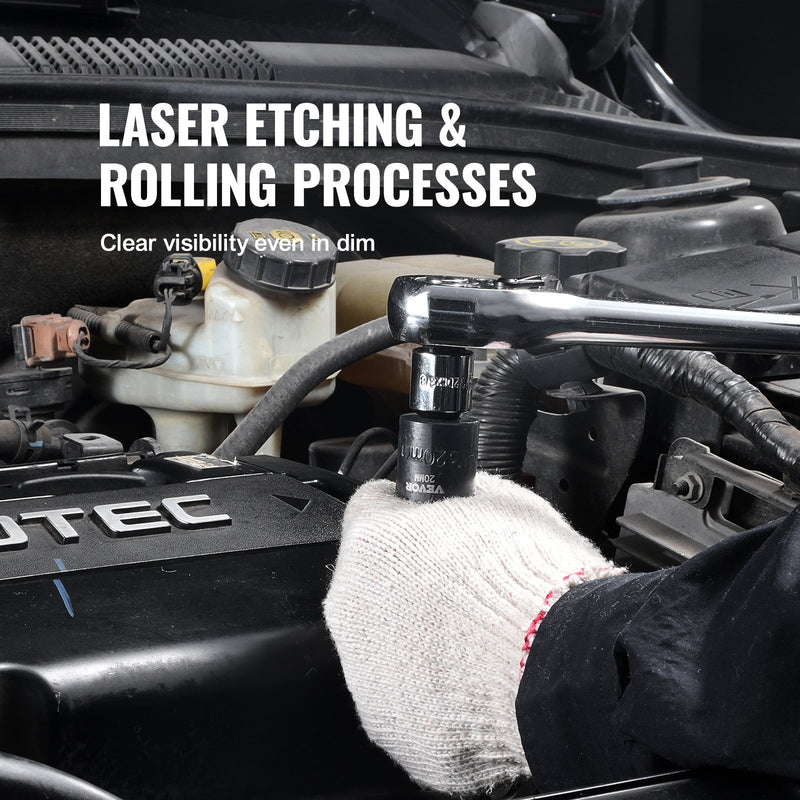 Skaidri izmēru marķējumi: Šī 14 daļīgā triecienskrūvgriežu uzmavu komplekta izmēri ir precīzi iegravēti ar lāzeru un velmēti, nodrošinot vieglu un ātru identificēšanu pat vājā apgaismojumā.