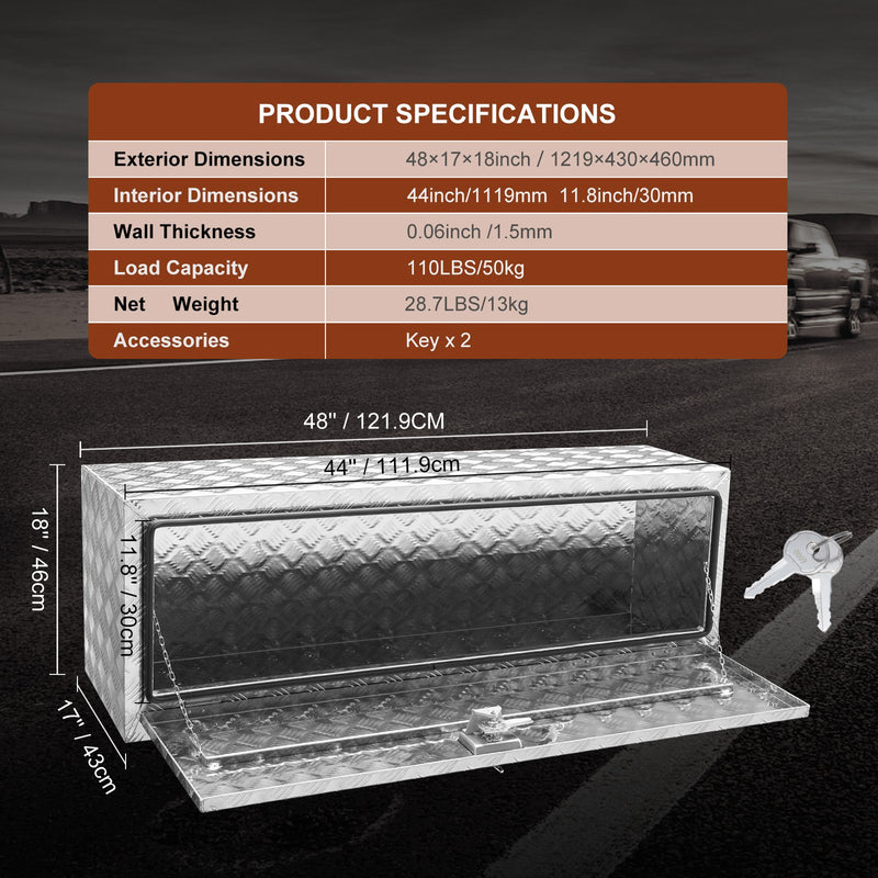 VEVOR zemās piekabes kravas kaste ir ideāls risinājums smagas slodzes uzglabāšanai. Tā ir izgatavota no izturīga alumīnija, kas nodrošina izturību. 1219 x 430 x 460 мм измерить нодрошину пиетеками даудз ветас инструментом у апрекоюмам. 50 кг slodzes ietilpība nodrošina pietiekamu vietu dažādu priekšmetu pārvadāšanai. Šī zemās piekabes kravas kaste piedāvā drošu, taču uzticamu uzglabāšanas risinājumu gan profesionālai, gan personiskai lietošanai. To var viegli apstrādāt un uzstādīt. Tā dizains ļauj to cieši uzstādīt zem kravas automašīnām, furgoniem un piekabēm. Tāpēc mūsu kaste ir izgatavota no alumīnija dimanta plāksnes, kas piešķir spēku un estētisko pievilcību, padarot to ideālu ikvienam, kuram nepieciešama droša un pieejama uzglabāšana. Mēs esam arī norādījuši dažas iespaidīgas funkcijas, kas padara mūsu zemās piekabes kravas kasti par uzticamu izvēli augstas kvalitātes uzglabāšanas prasībām. Tā unikālais dizains un konstrukcija ļauj jums uzticēties, ka jūsu priekšmeti paliks droši un pasargāti.