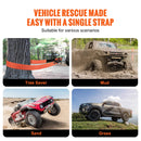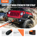 VEVOR heavy duty tow strap attached to red vehicle's d-rings, ideal for trailer towing and roadside rescue.