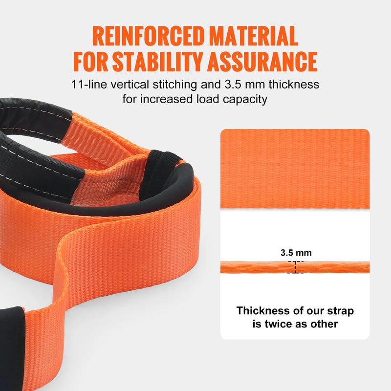 VEVOR heavy duty tow strap with reinforced sleeves, multi-strand braiding, and 11-line vertical stitching.