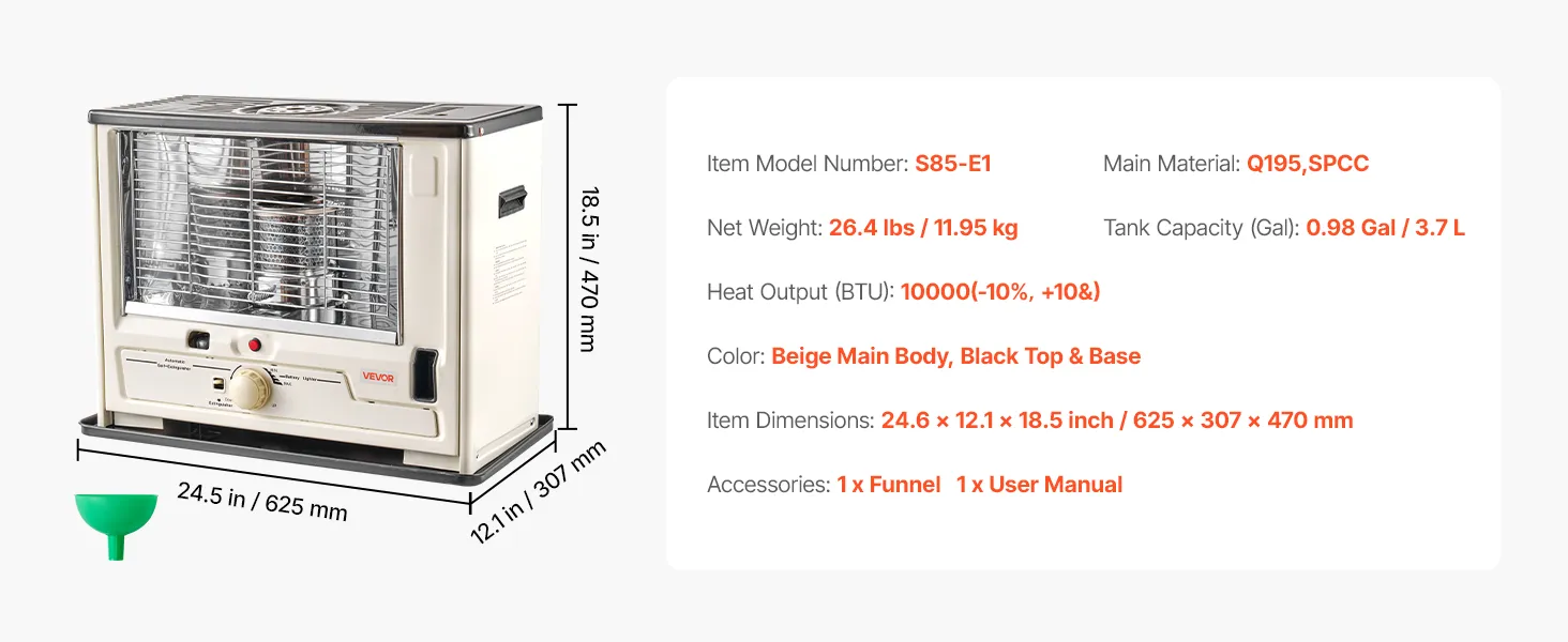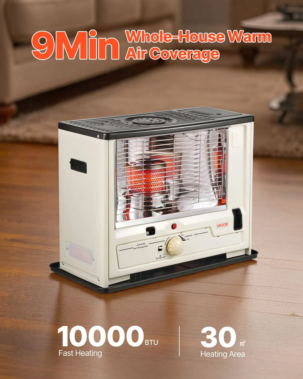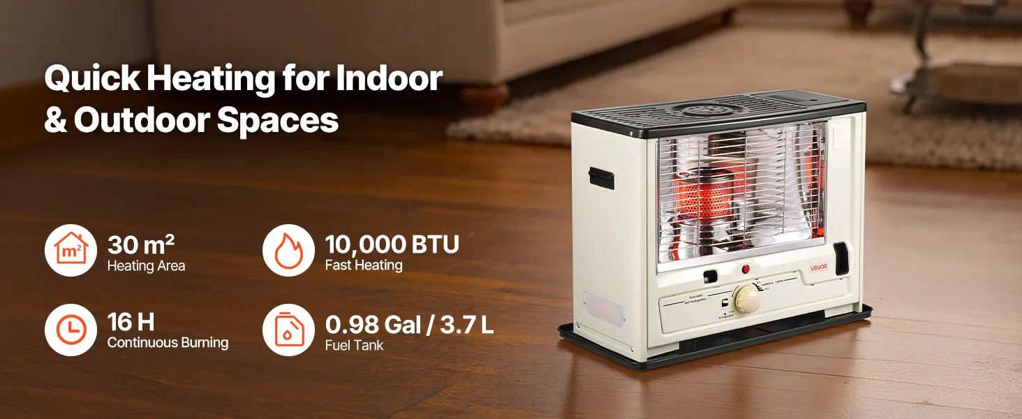 Silda līdz 30 m² telpu tikai 9 minūtēs ar jaudu 10 000 BTU. Ideāli piemērots kā starojuma tipa petrolejas sildītājs, nodrošinot ātru un vienmērīgu siltumu gan iekštelpās, gan ārā.
