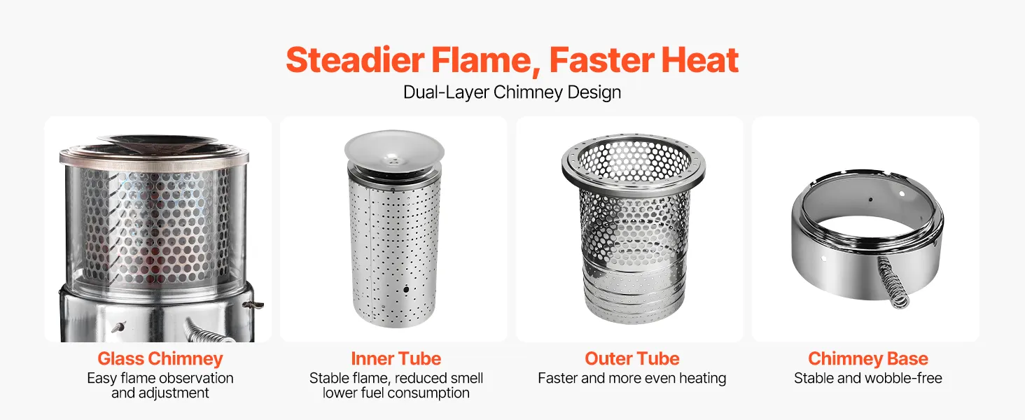 Komplektā ietverti trīs dažādi skursteņu tipi dažādām uzstādīšanas iespējām. Neatkarīgi no tā, vai lietojat sildītāju telpās vai ārā, tas nodrošina elastīgu un drošu ventilāciju.