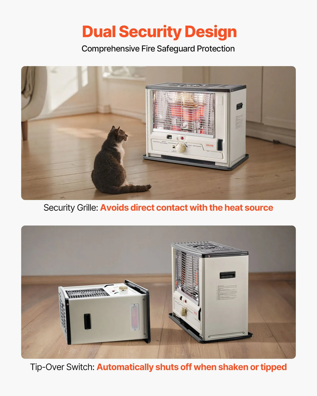 Trīskāršā aizsardzība novērš pārkaršanu, apgāšanos vai riskus, ja sildītājs atrodas pārāk tuvu priekšmetiem. Uzticams pārnēsājams petrolejas sildītājs mājām, garāžām un teltīm.