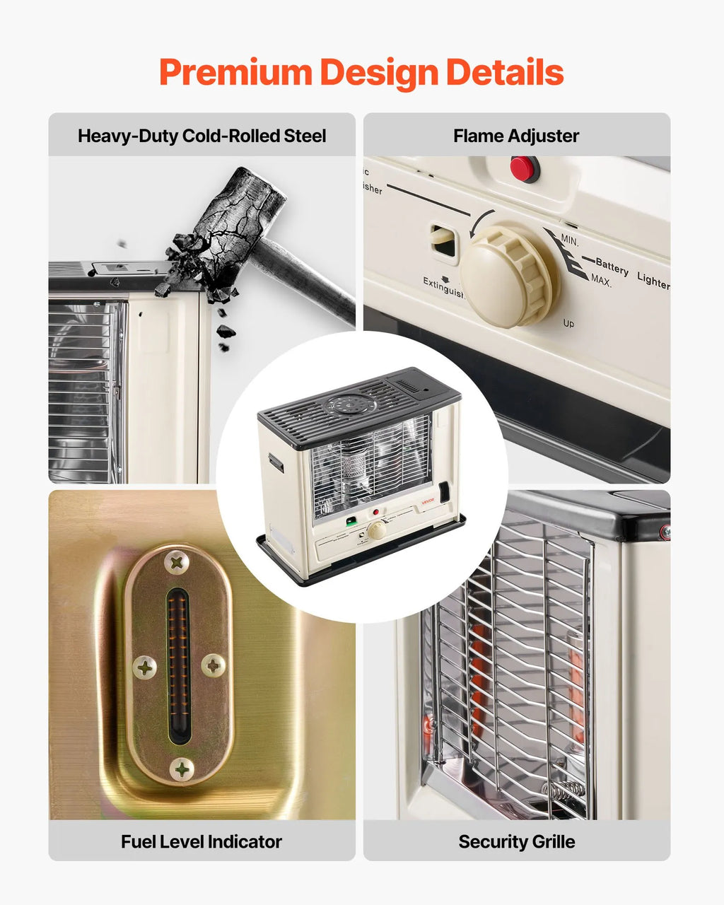 Neatkarīgi no tā, vai atrodies garāžā, dzīvojamā istabā, teltī vai kempingā, šis starojuma tipa petrolejas sildītājs nodrošina uzticamu siltumu gan atklātās, gan slēgtās telpās ar minimālu uzstādīšanu.