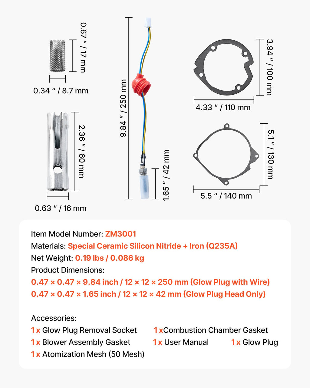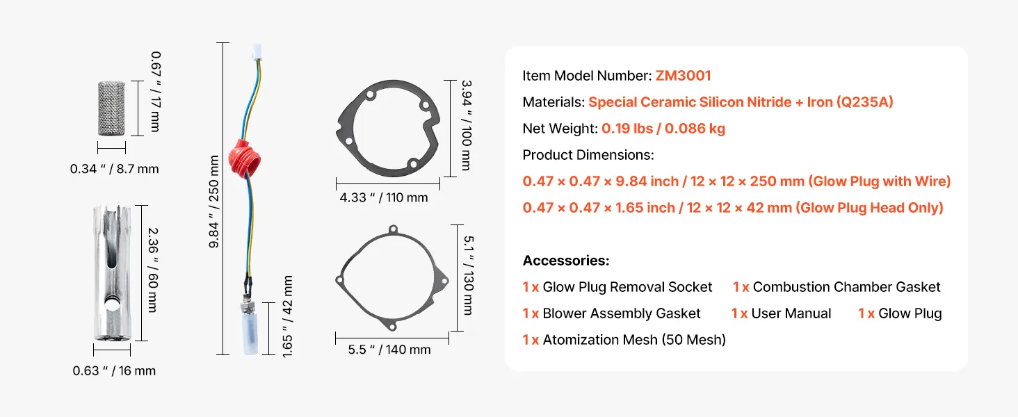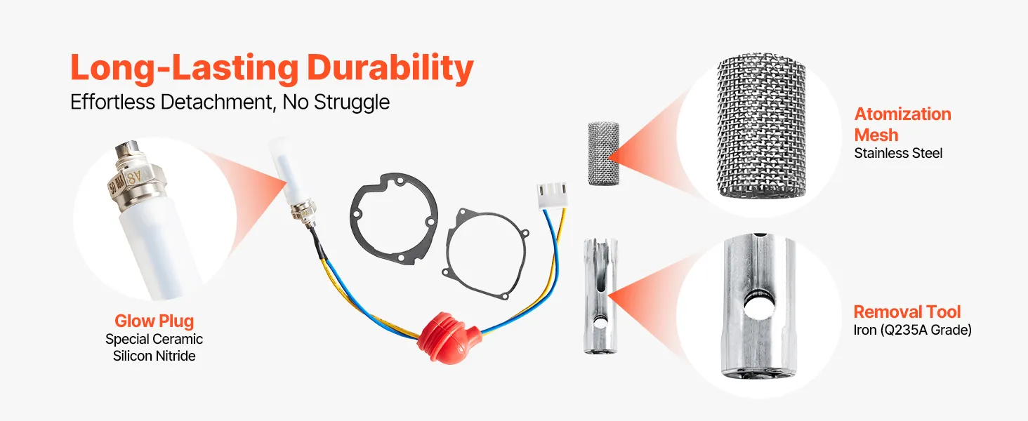 Uzticams apkures piederums: VEVOR dīzeļa sildītāja kvēlsveces komplekts ir izgatavots no īpaša silīcija nitrīda keramikas, kas izceļas ar augstu temperatūras izturību, labu siltumvadītspēju un lielu cietību. Tas nodrošina stabilu veiktspēju un ilglaicīgu uzticamību arī pie lielām slodzēm.
