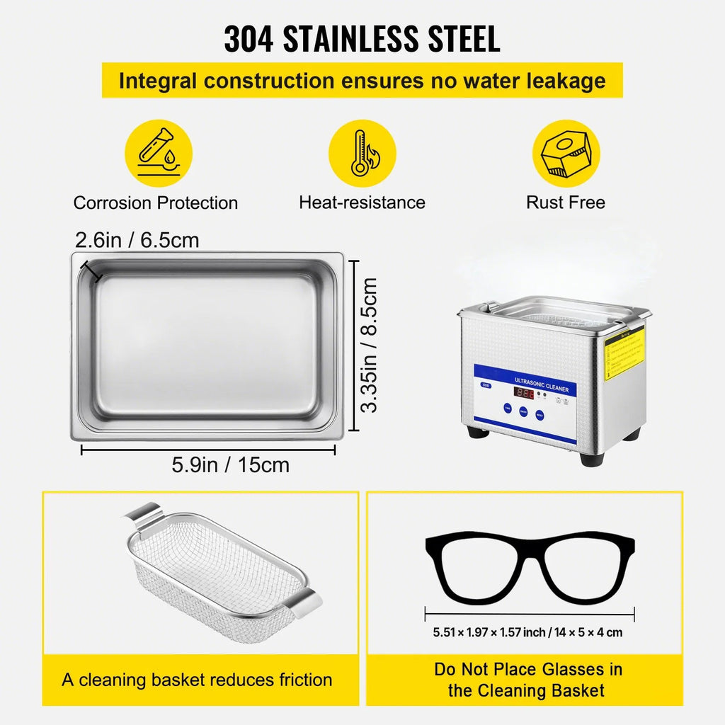 VEVOR ultraskaņas tīrītāja tvertne ir izgatavota no 304. klases nerūsējošā tērauda, kas ir noturīgs pret rūsu un koroziju.