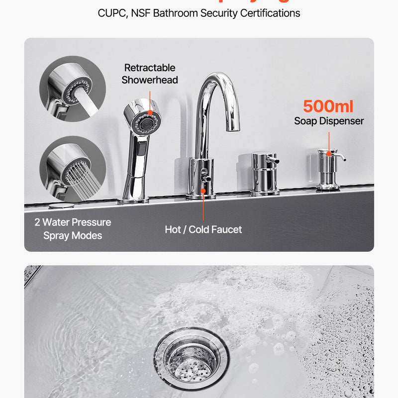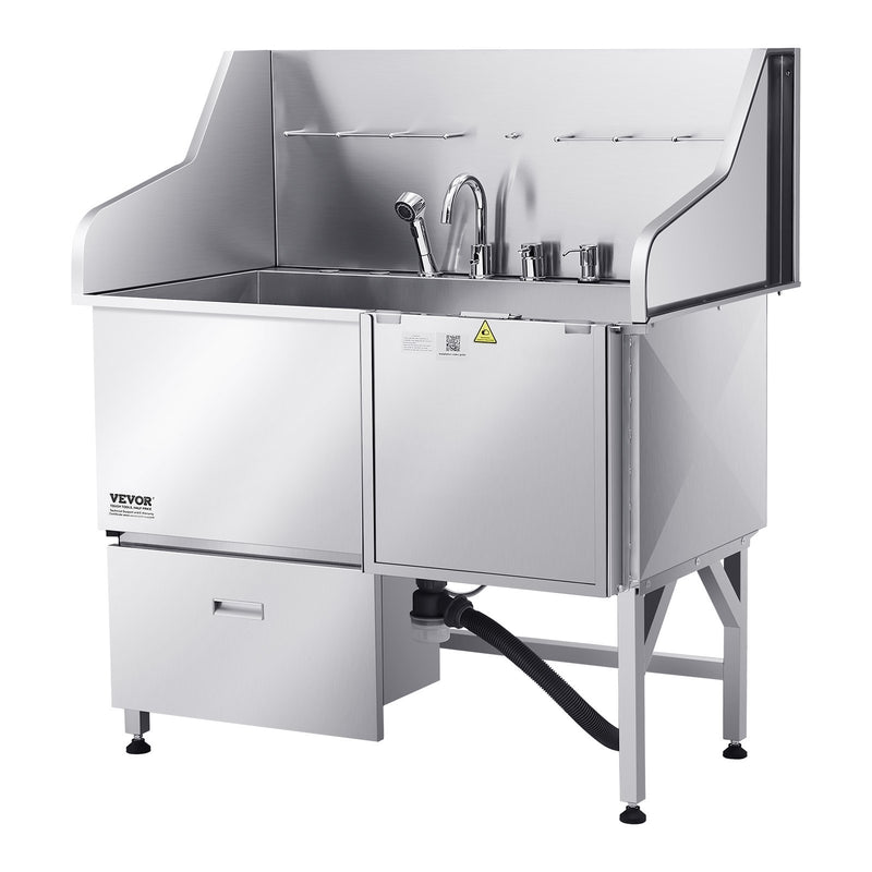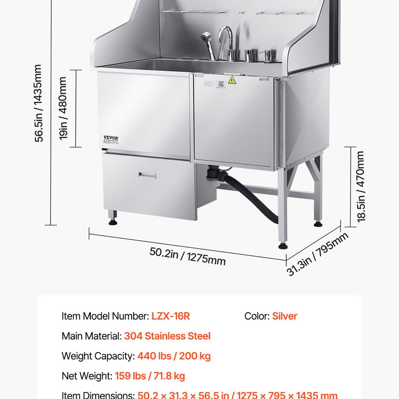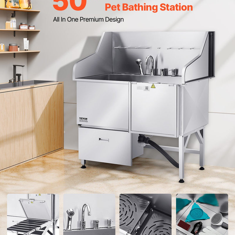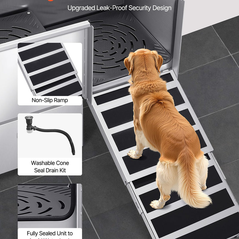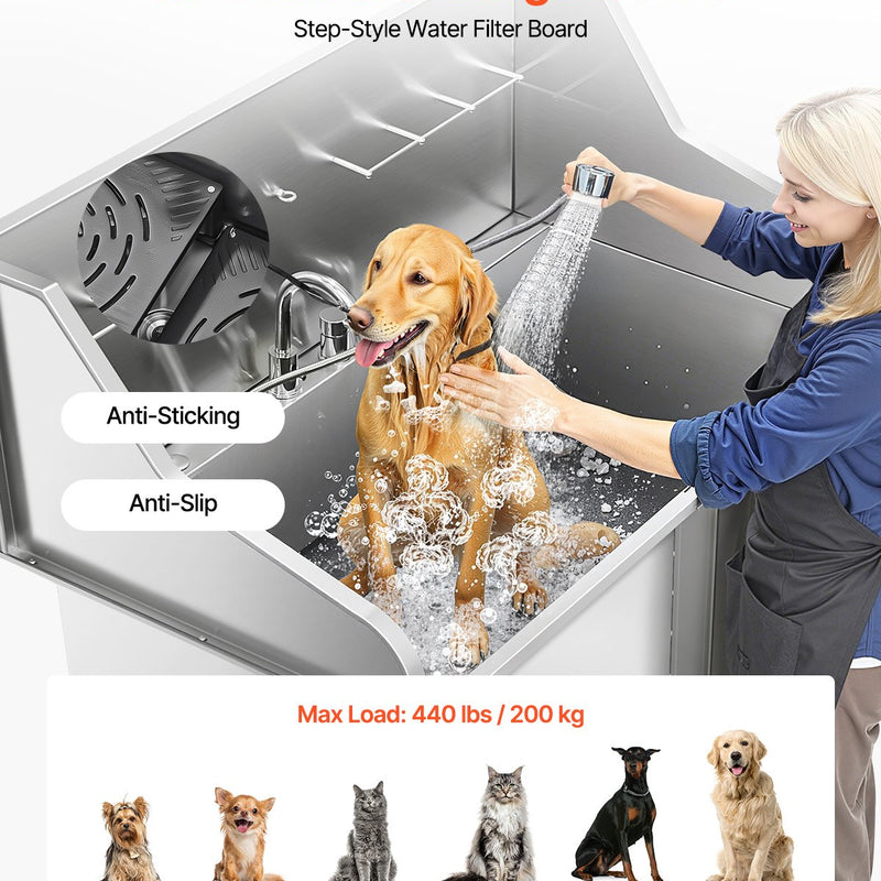 Suņu kopšanas vanna atbilst CUPC un NSF vannas istabas drošības sertifikātiem. Karstā un aukstā ūdens jaucējkrāni un maiga/spēcīga dušas spiediena regulēšanas iespēja nodrošina pielāgojamību. 500 мл лила иетилпиба зиепью дозатора гарантируют илгу литошану старп узпилдем. Vannas korpuss izgatavots no 304 nerūsējošā tērauda, kas ir izturīgs pret skrāpējumiem un koroziju.