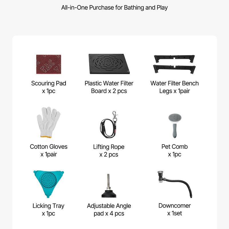Komplektā ietilpst dušas galva, jaucējkrāns un tieša pieslēgšanās mājas ūdens šļūtenei, kas nodrošina ilgtspējību. Tāpat ir iekļauta laizīšanas plāksne, birste un cimdi, lai jūsu mājdzīvnieks baudītu pilnvērtīgu un patīkamu vannošanas pieredzi.