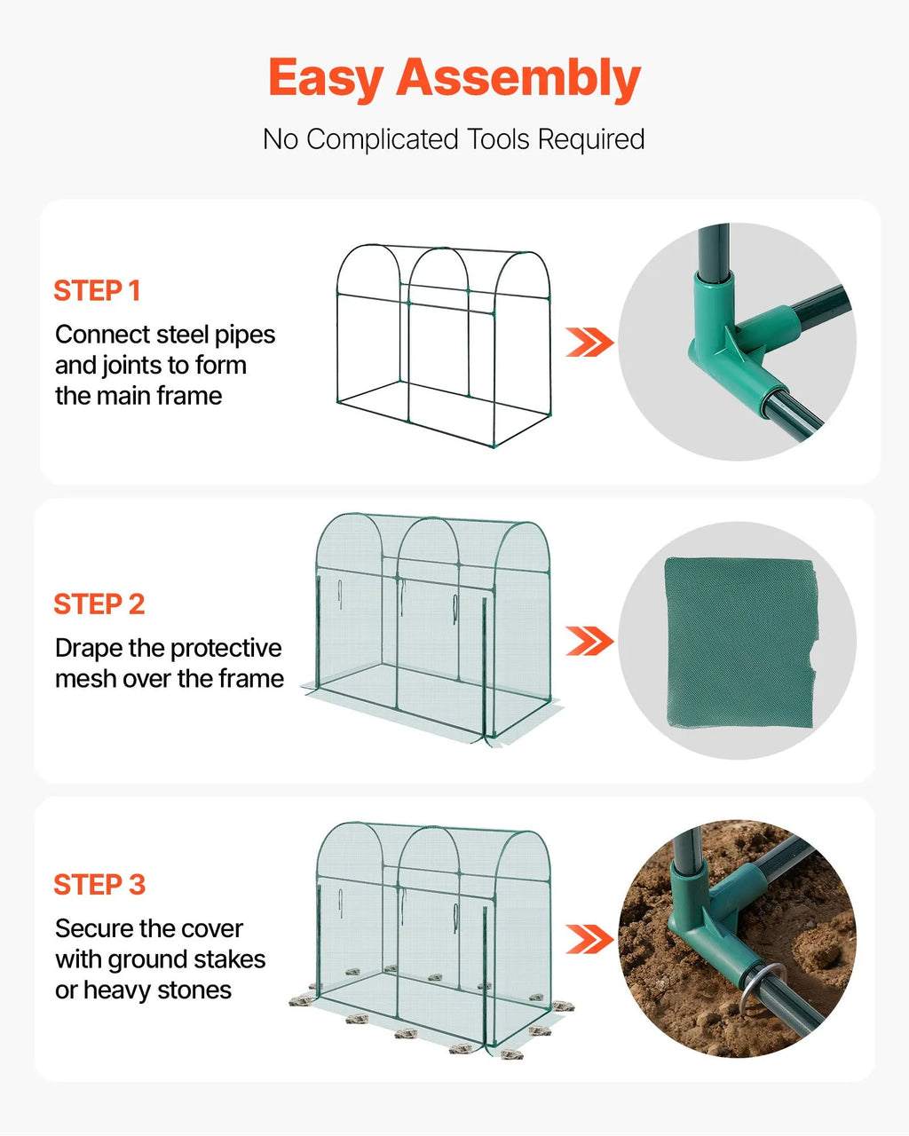 Vienkārša uzstādīšana: Pārdomātā konstrukcija ļauj ātri uzstādīt bez instrumentiem un sarežģītām darbībām. Savienojiet tērauda caurules ar savienotājiem, uzvelciet aizsargtīklu un nostipriniet ar zemes mietiņiem vai akmeņiem.