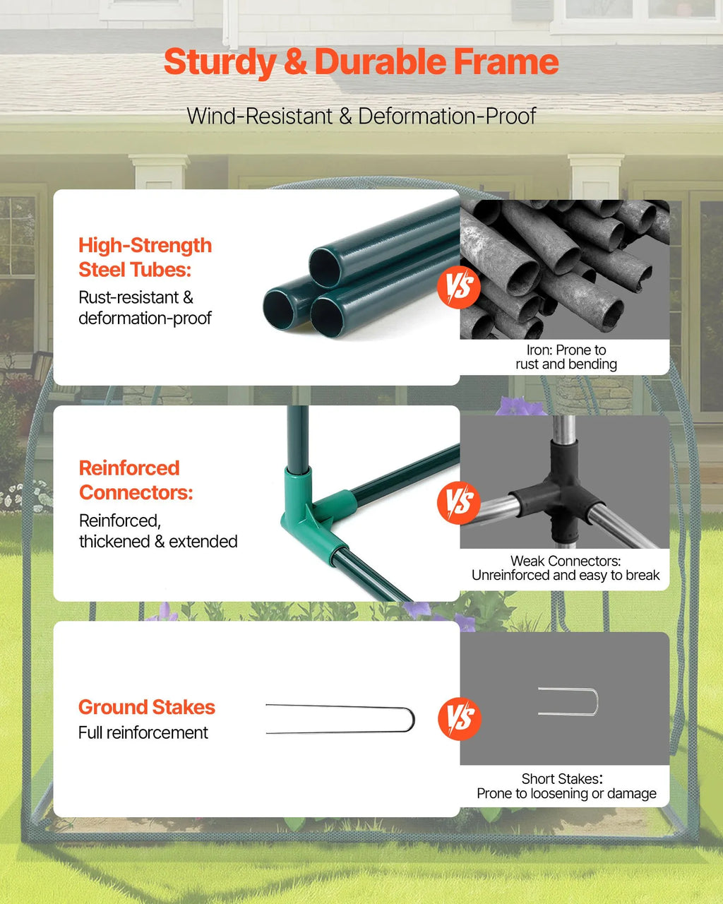 Stabils un vēja izturīgs: Izgatavots no pulverkrāsotām tērauda caurulēm, augu aizsardzības telts ir noturīga pret rūsu un koroziju. Pastiprinātie plastmasas savienojumi cieši pieguļ galvenajam rāmim, nodrošinot papildu stabilitāti, bet U veida zemes mietiņi uzlabo noturību pret vēju.