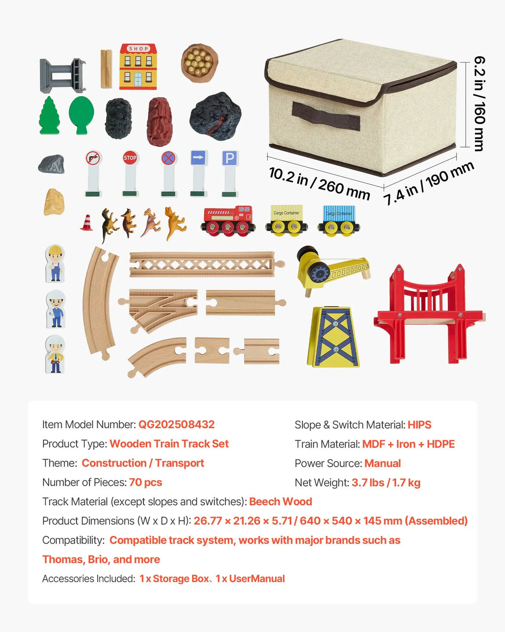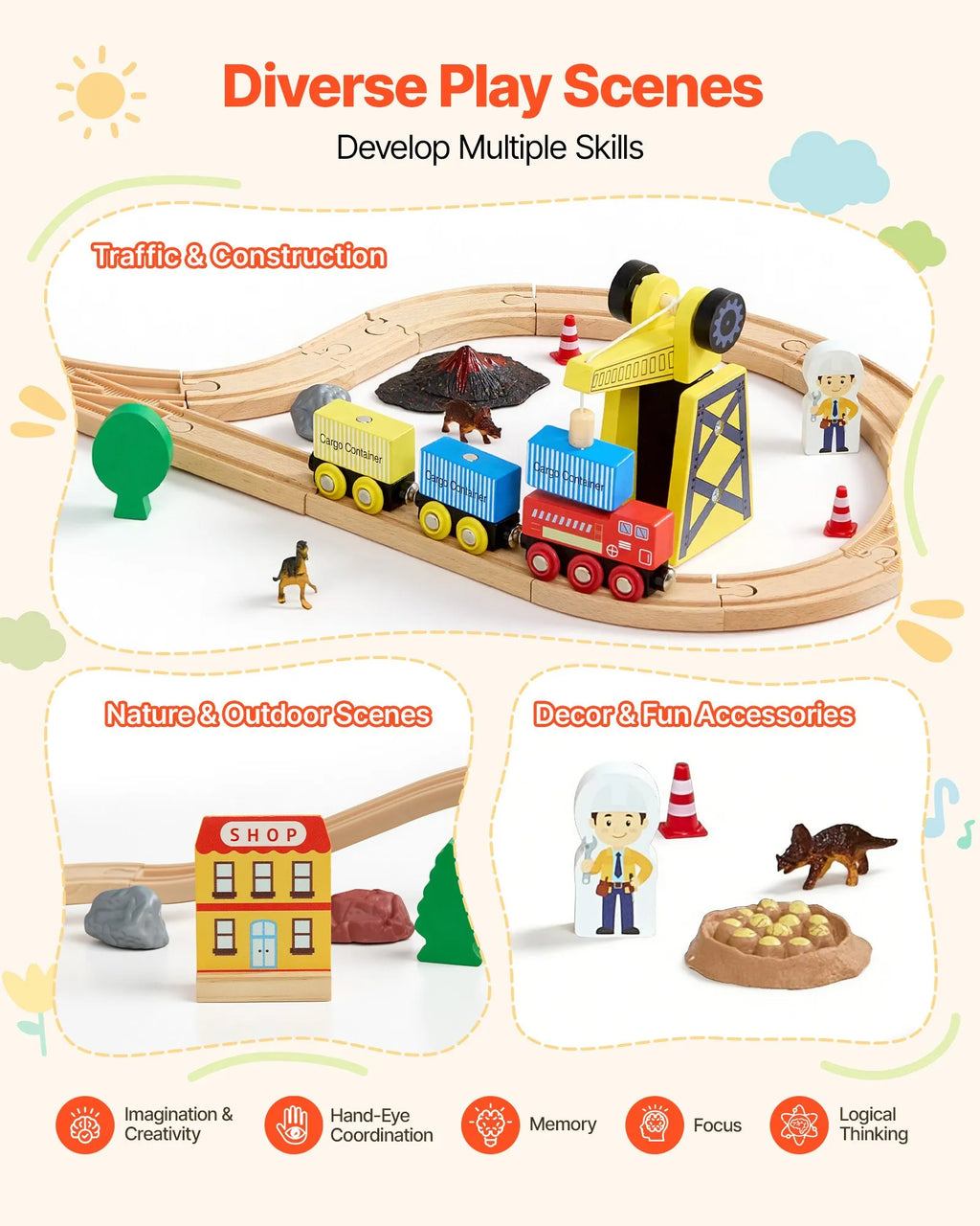VEVOR Koka vilciena komplekts 70 gab. ar magnētisko celtni, koka dzelzceļa rotaļlieta bērniem 3–8 gadiem, būvniecības tematikas dzelzceļa komplekts, savietojams ar populāriem zīmoliem, Ziemassvētku vai dzimšanas dienas dāvana zēniem un meitenēm