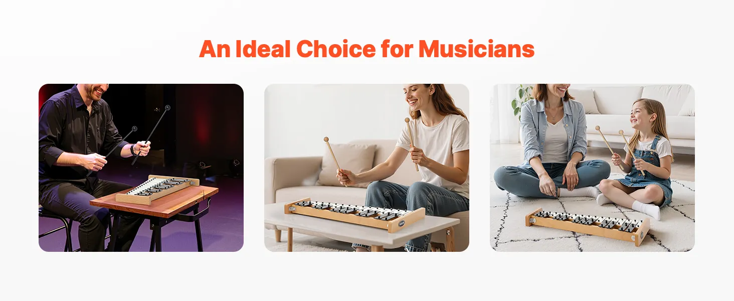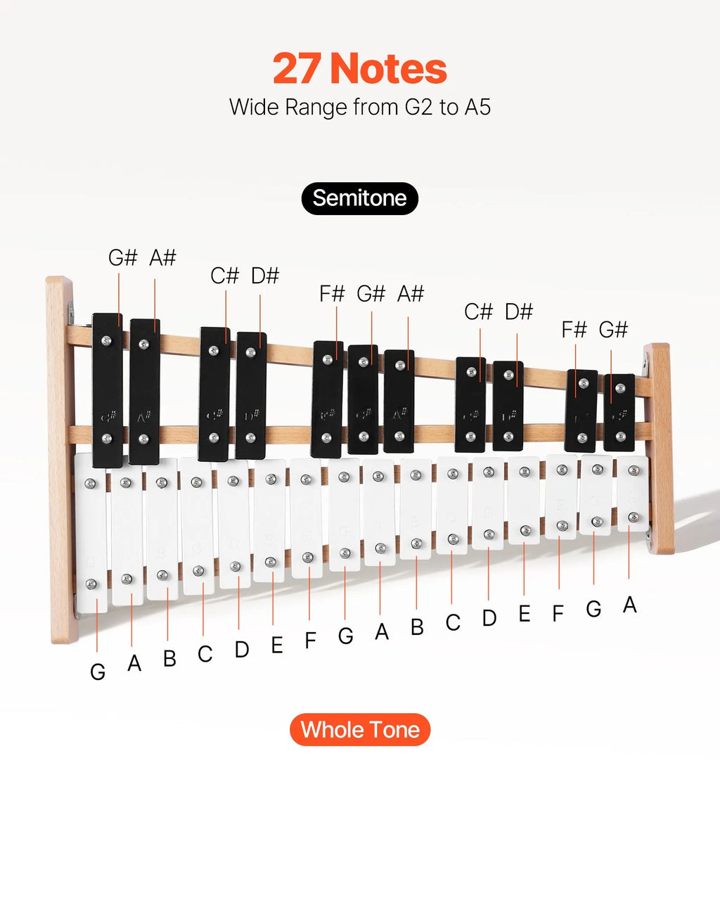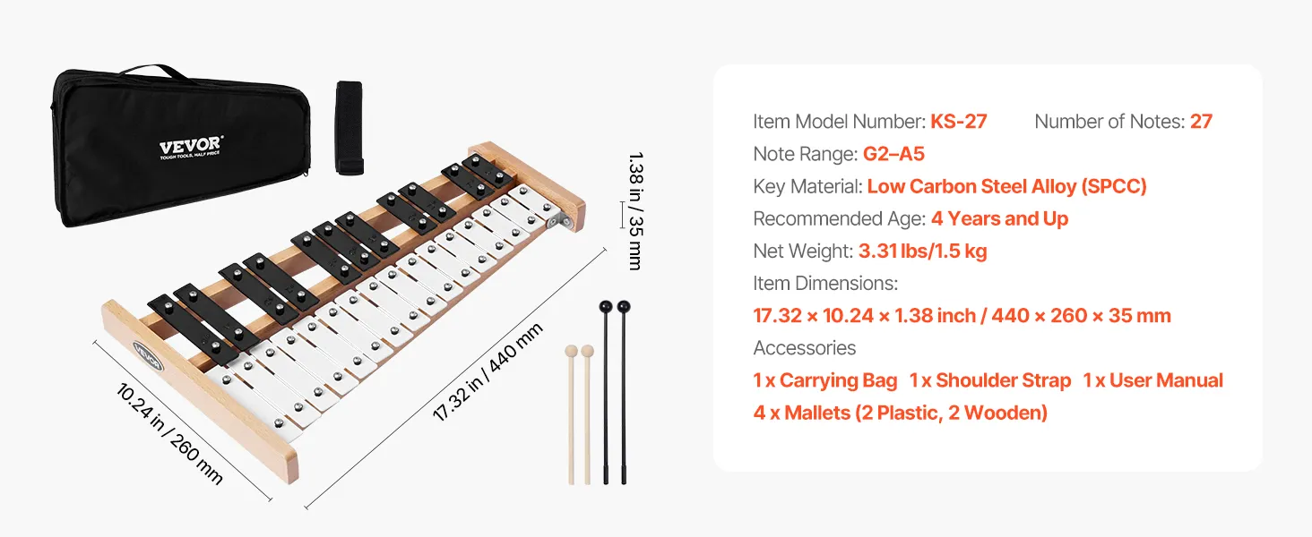 VEVOR metalofons ar 27 notīm, profesionāls perkusiju instruments ar metāla plāksnītēm, 4 vālītēm un pārnēsāšanas somu, piemērots iesācējiem un pieaugušajiem mūzikas apguvei