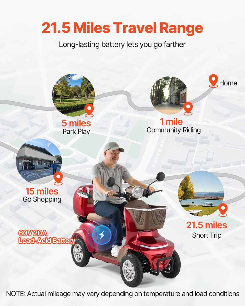 Stabila braukšana: Šis smagās klases 4 riteņu mobilitātes skrejritenis ir aprīkots ar uzlādējamu 60 V 20 Ah svina-skābes akumulatoru, kas nodrošina ilgstošu darbību ar līdz 35 km nobraukumu ar vienu uzlādi. Dziļa protektora bezpiepūšanas riepas nodrošina vieglāku un stabilāku braukšanu, savukārt priekšējā un aizmugurējā atsperu balstiekārta absorbē triecienus, garantējot līdzsvarotu un ērtu pārvietošanos