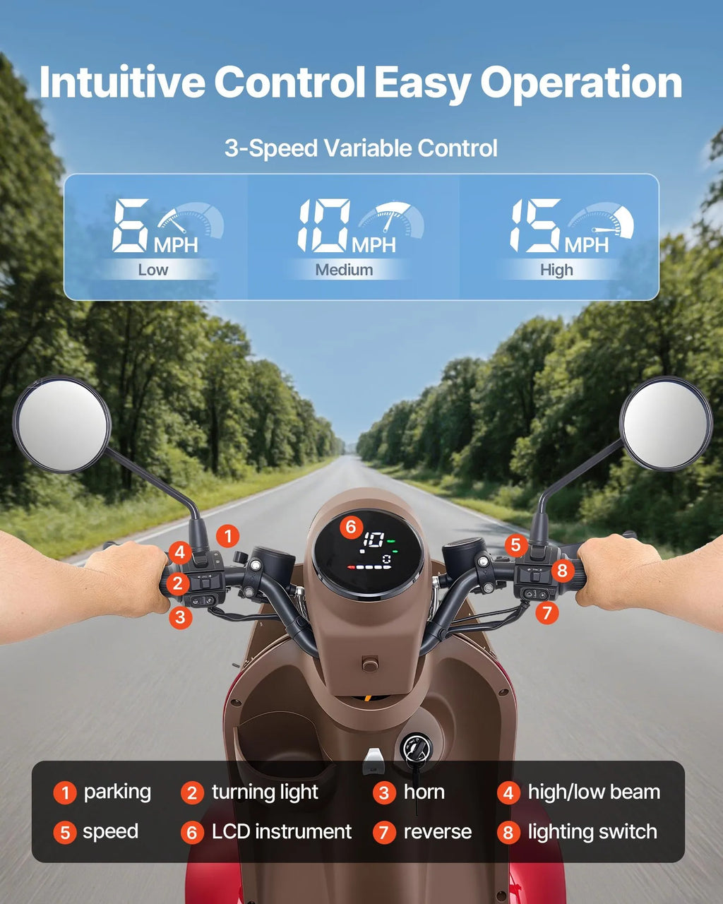 3 ātrumu elastība: Elektriskais atpūtas mobilitātes skrejritenis piedāvā trīs regulējamus ātruma režīmus (10 km/h, 16 km/h, 24 km/h), ļaujot pielāgot braukšanu dažādām situācijām. Tas ir ideāli piemērots iepirkšanās braucieniem vai nesteidzīgai izbraukšanai. Vadības panelī skaidri redzams ātrums, nobraukums un akumulatora uzlādes līmenis reāllaikā