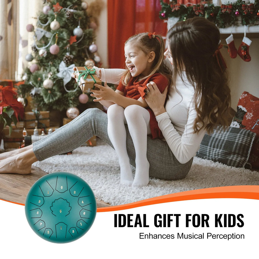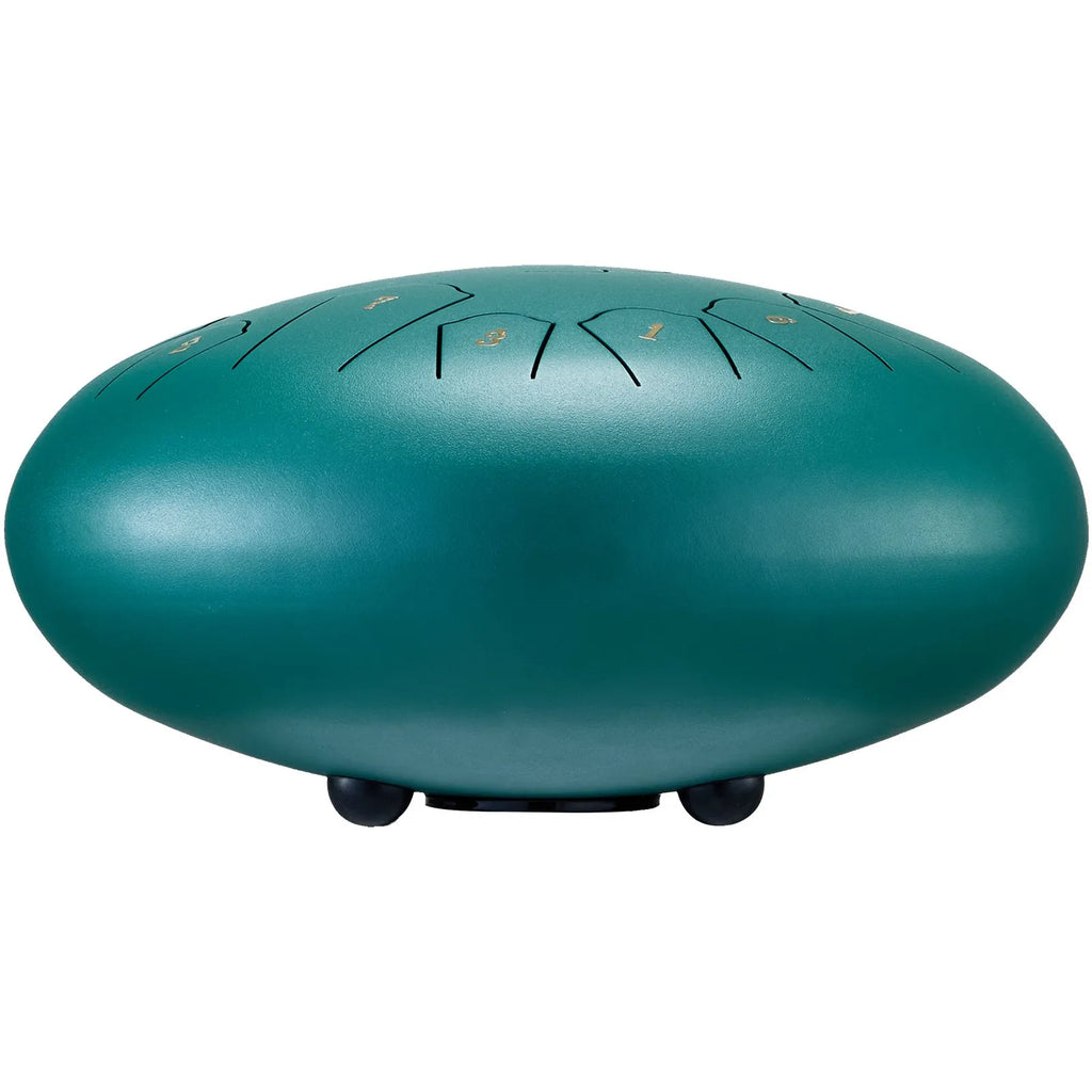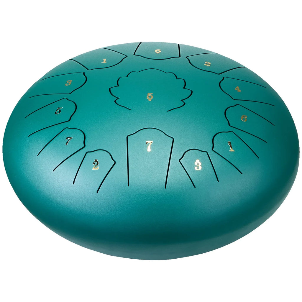 VEVOR tērauda mēles bungas, 12" ar 13 notīm, C mažors, piemērotas dārzam un āra lietošanai, komplektā 2 vālītes un pārnēsāšanas soma, rokas perkusiju instruments meditācijai, muzikālajai izglītībai un jogai, zaļā krāsā.