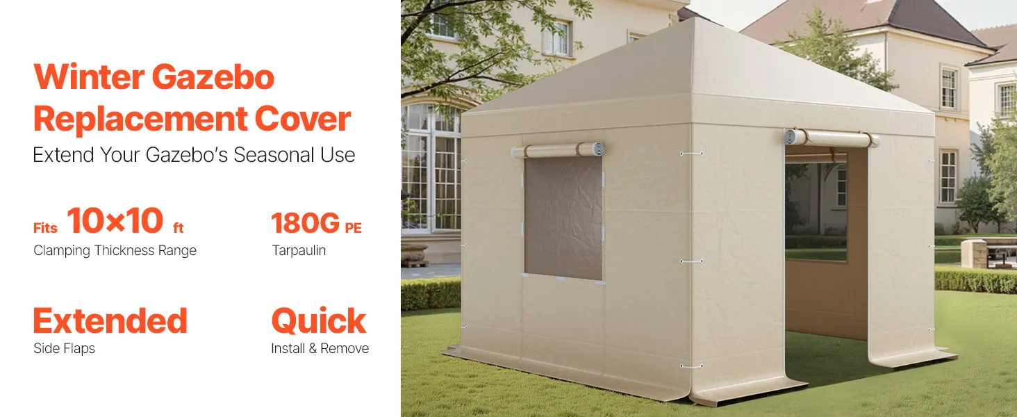 Piemērots 3,05 × 3,05 m paviljoniem: šis ziemas paviljona pārsegs ir paredzēts 3,05 × 3,05 m paviljoniem (paviljons nav iekļauts komplektā). Pārsegam ir jumta pārkares visās četrās pusēs, kas pielāgojas dažādiem augstumiem un slīpumiem, nodrošinot drošu un precīzu piegulšanu. Tas nodrošina pilnīgu pārklājumu, lai pasargātu Jūsu paviljonu.