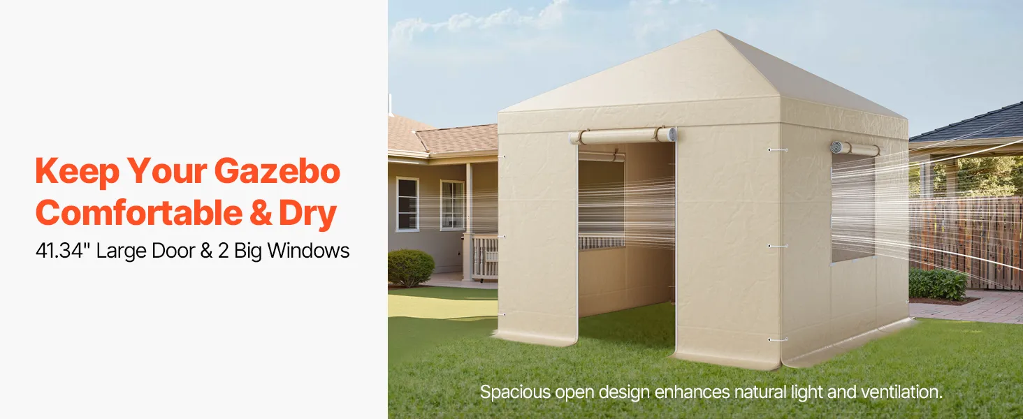Izturīgs PE pārsegs: izgatavots no augstas stiprības 180 g/m² PE materiāla ar ūdensnecaurlaidīgu un saules starus bloķējošu pārklājumu abās pusēs. Cietā jumta paviljonu pārsegs efektīvi pasargā no vēja, stipra lietus, sniega un intensīvas saules, nodrošinot paviljona un mēbeļu drošību visu gadu.